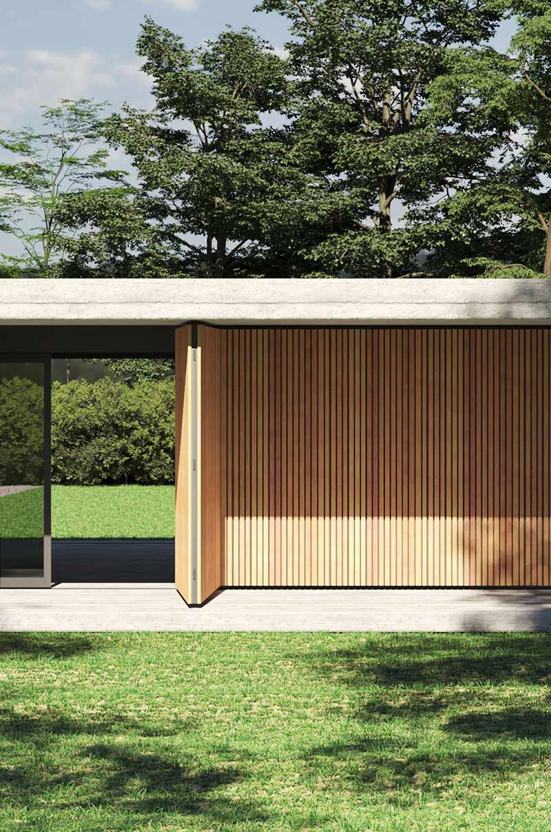 A contemporary vacation home designed to blend seamlessly into its natural surroundings, featuring expansive views of the lake and surrounding green nature hill mountains.